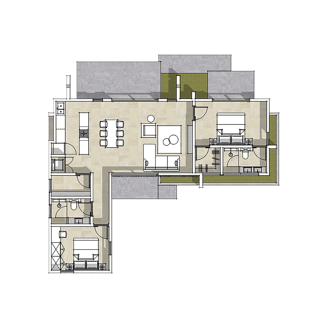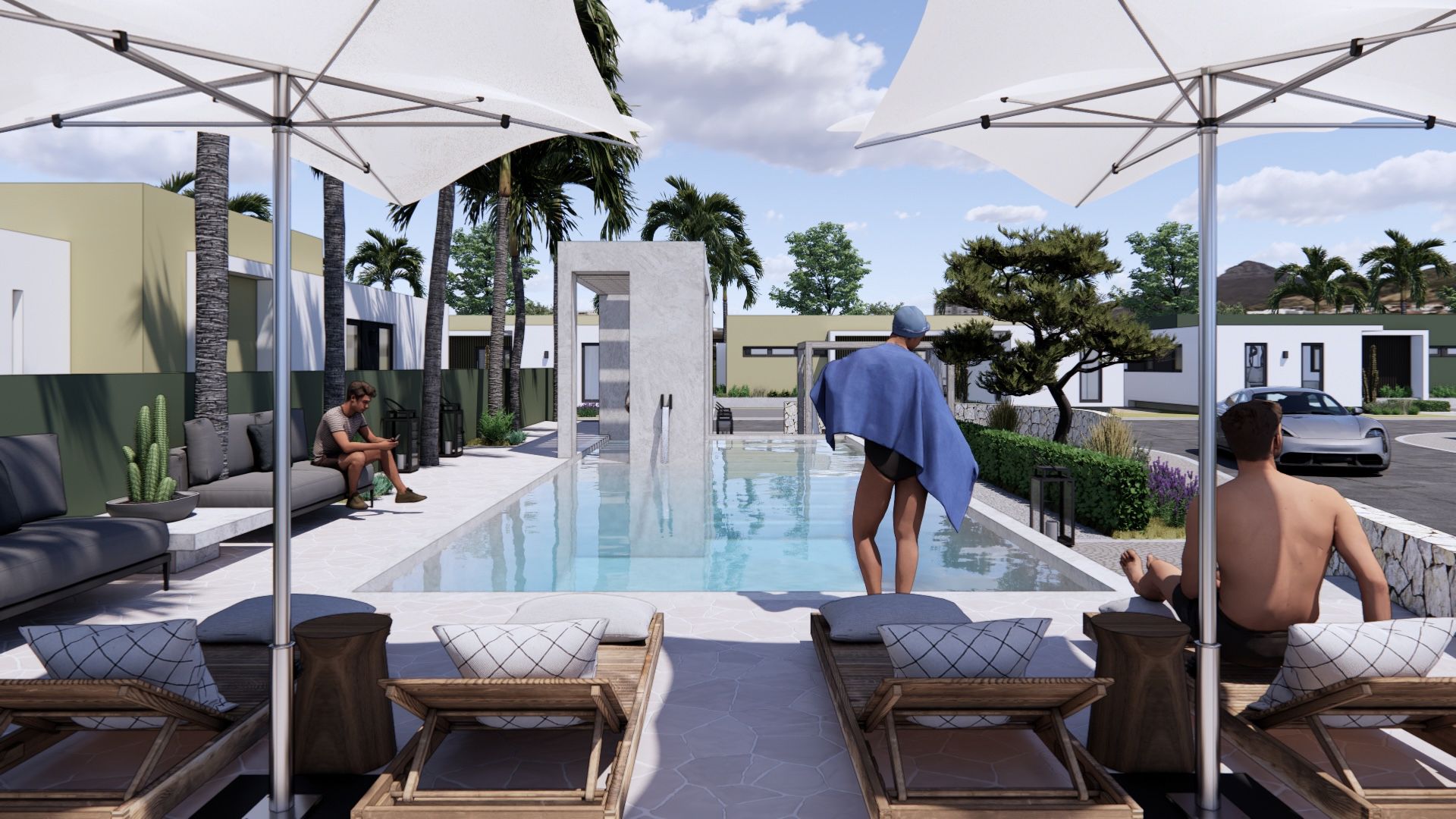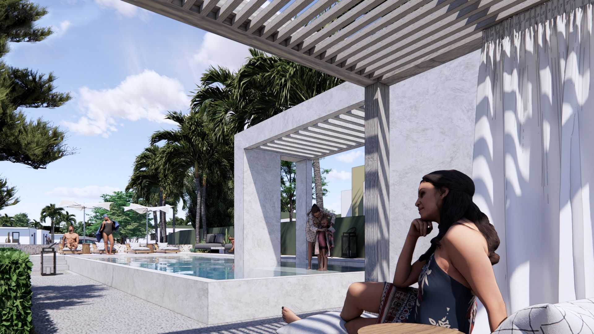 Novaura Garden communal pool features a raised design with two infinity edges, surrounded by lush greenery, private cabana with luxury bathrooms. Additionally, there are 5 visitor parking spaces in the communal area.