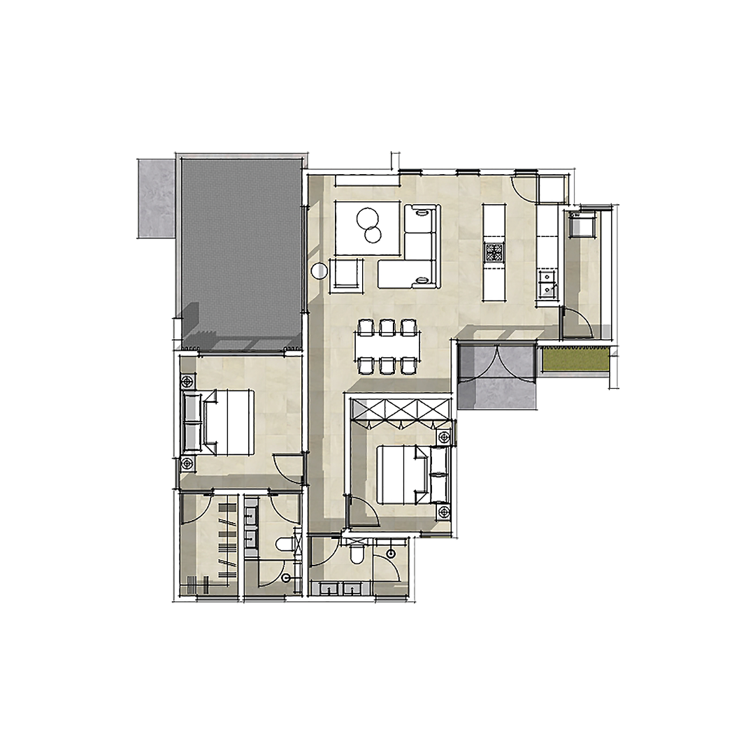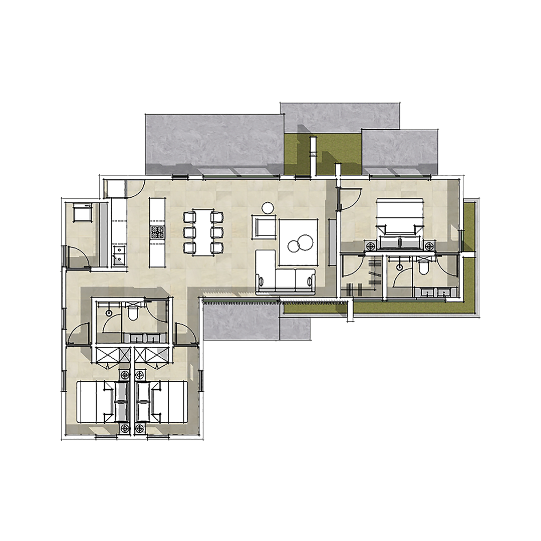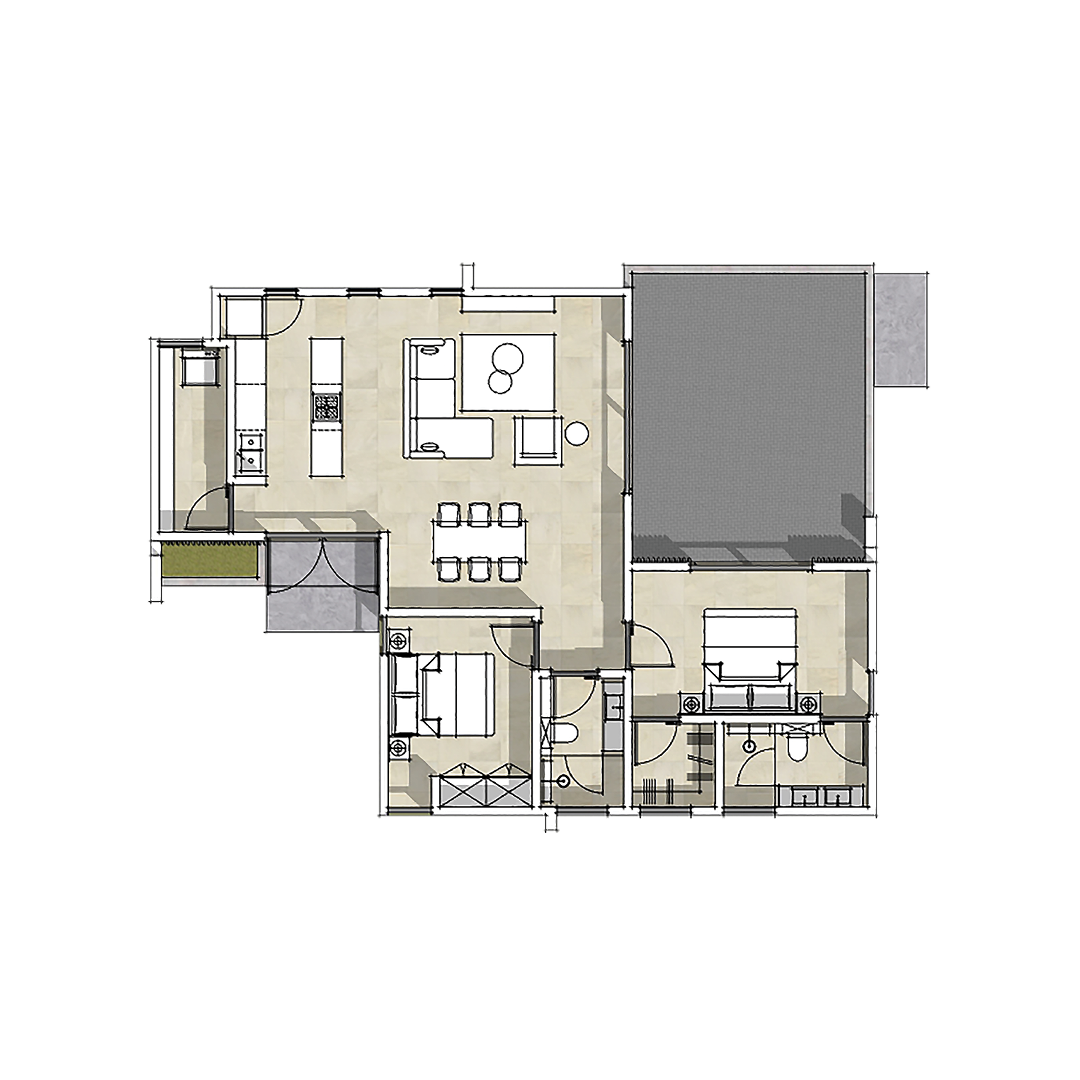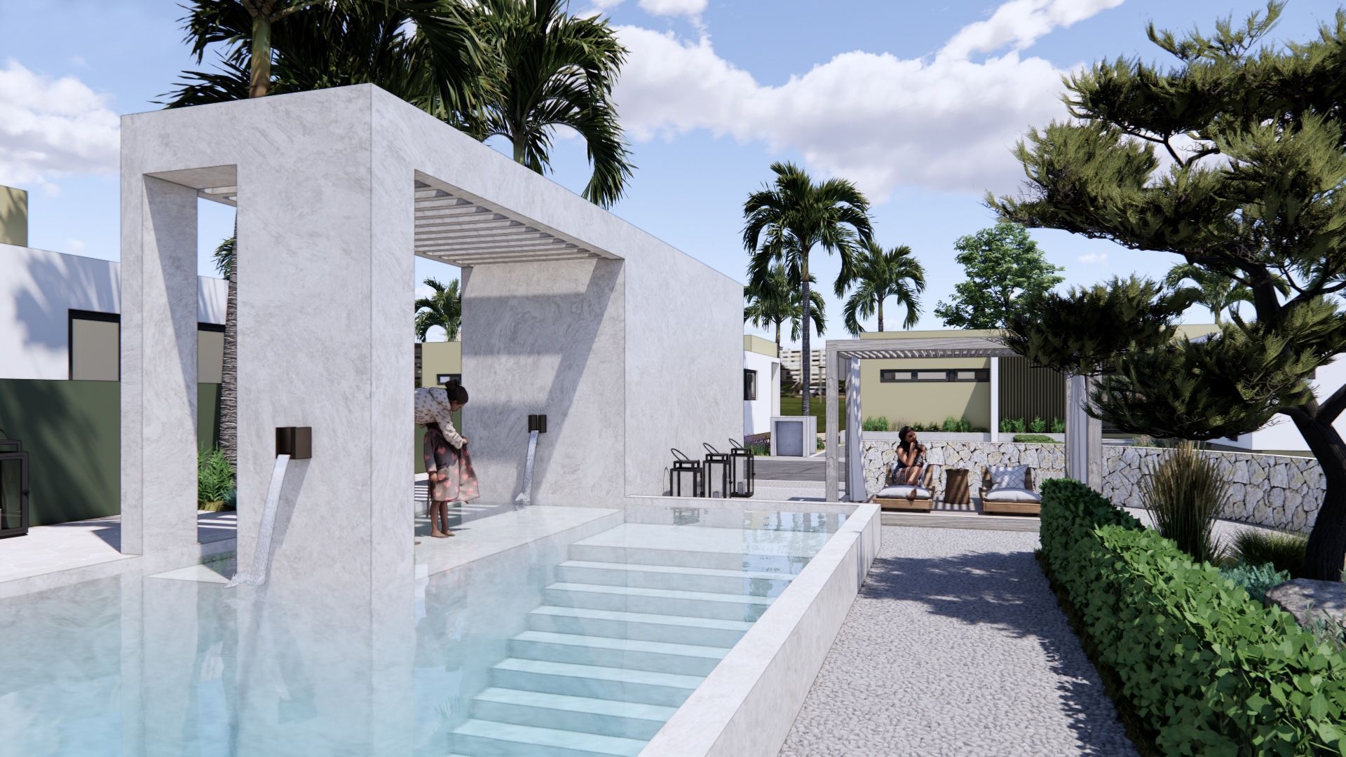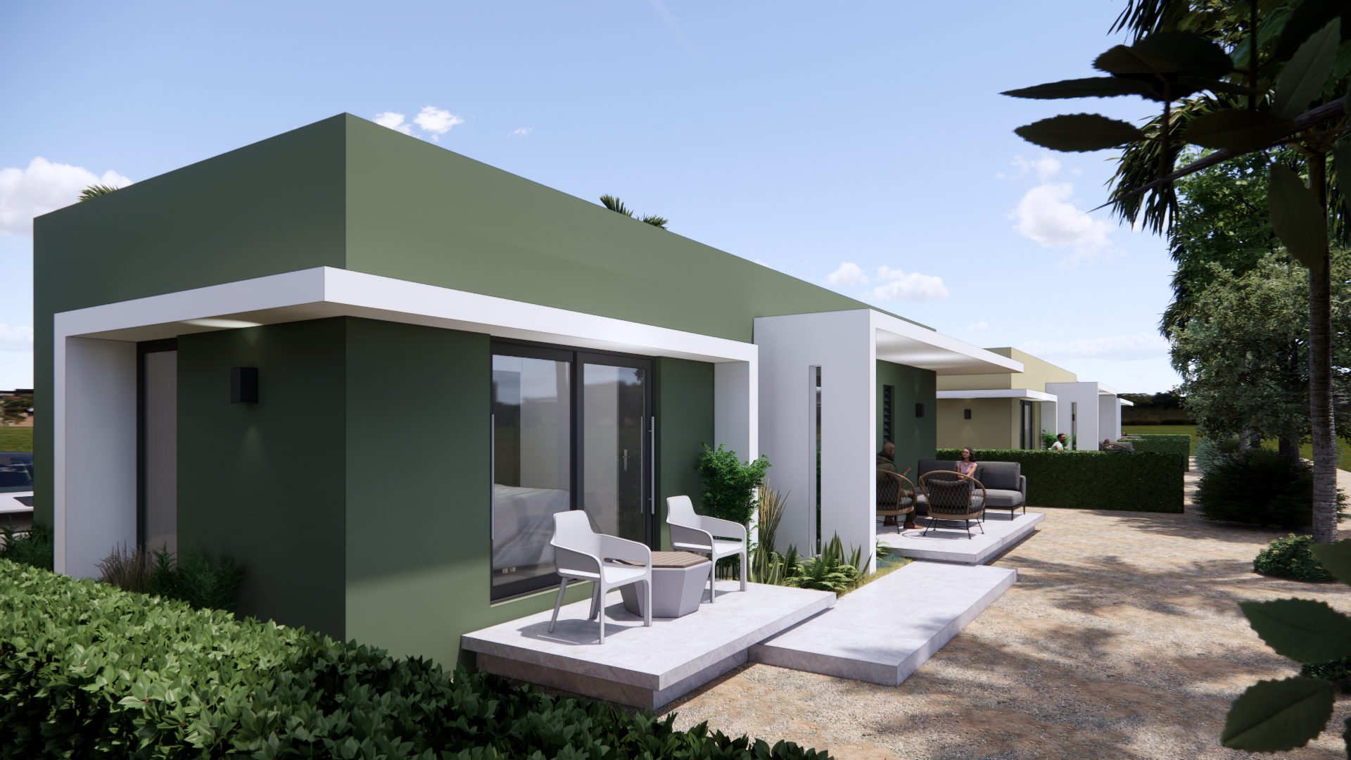 Novaura Garden comprises a total of 30 single-family homes, including 15 two-bedroom, two-bathroom houses, as well as 15 three-bedroom, two-bathroom houses. Each home comes with two designated parking spaces and ownership of the private lot. The resort features a digital entrance gate with security cameras, additional emergency exit, and a gated community with tall perimeter fencing. Novaura Garden feature a modern aesthetic typically found in higher-end properties. The flat concrete roofs are ideal for solar panel installation.
